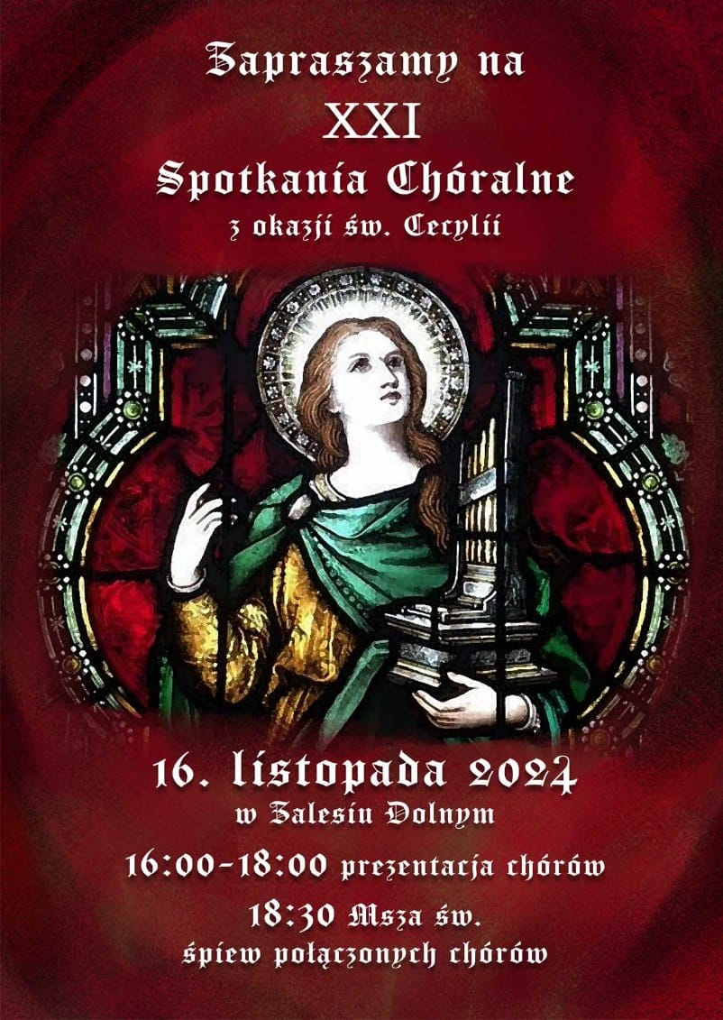 Chór Liturgiczny Parafii NMP Wspomożenia Wiernych w Zalesiu Dolnym i Stowarzyszenie „Musicam Sacram” zapraszają na XXI SPOTKANIA CHÓRALNE Z OKAZJI ŚW. CECYLII, które odbędą się w naszym kościele w sobotę 16 listopada o godz. 16:00. Zwieńczeniem spotkania będzie Msza Święta o 18:30 z połączeniem chórów.